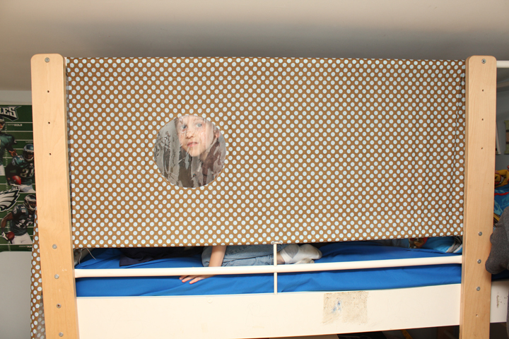 So, I set to work on a curtain contraption, but I wanted it to be more than a curtain. I wanted it to be a cozy retreat. So I added a little window. I want him to know what's on the other side of the curtain at all times. I mean, I'm 31 and I still hate the feeling of my feet hanging over the edge of the bed for fear of creatures living under there!!
